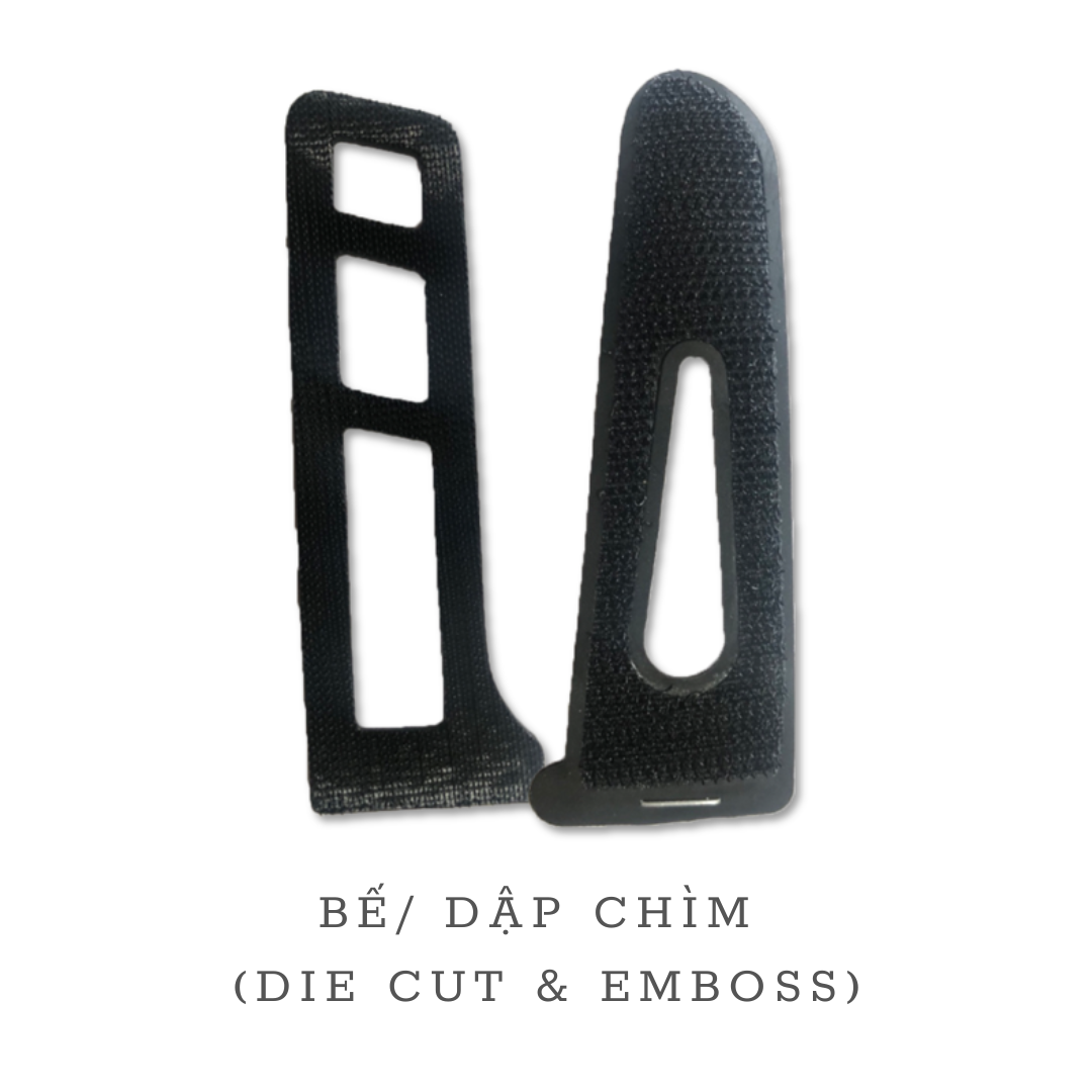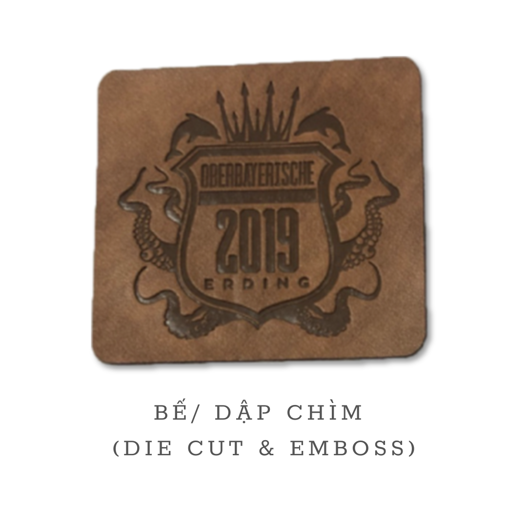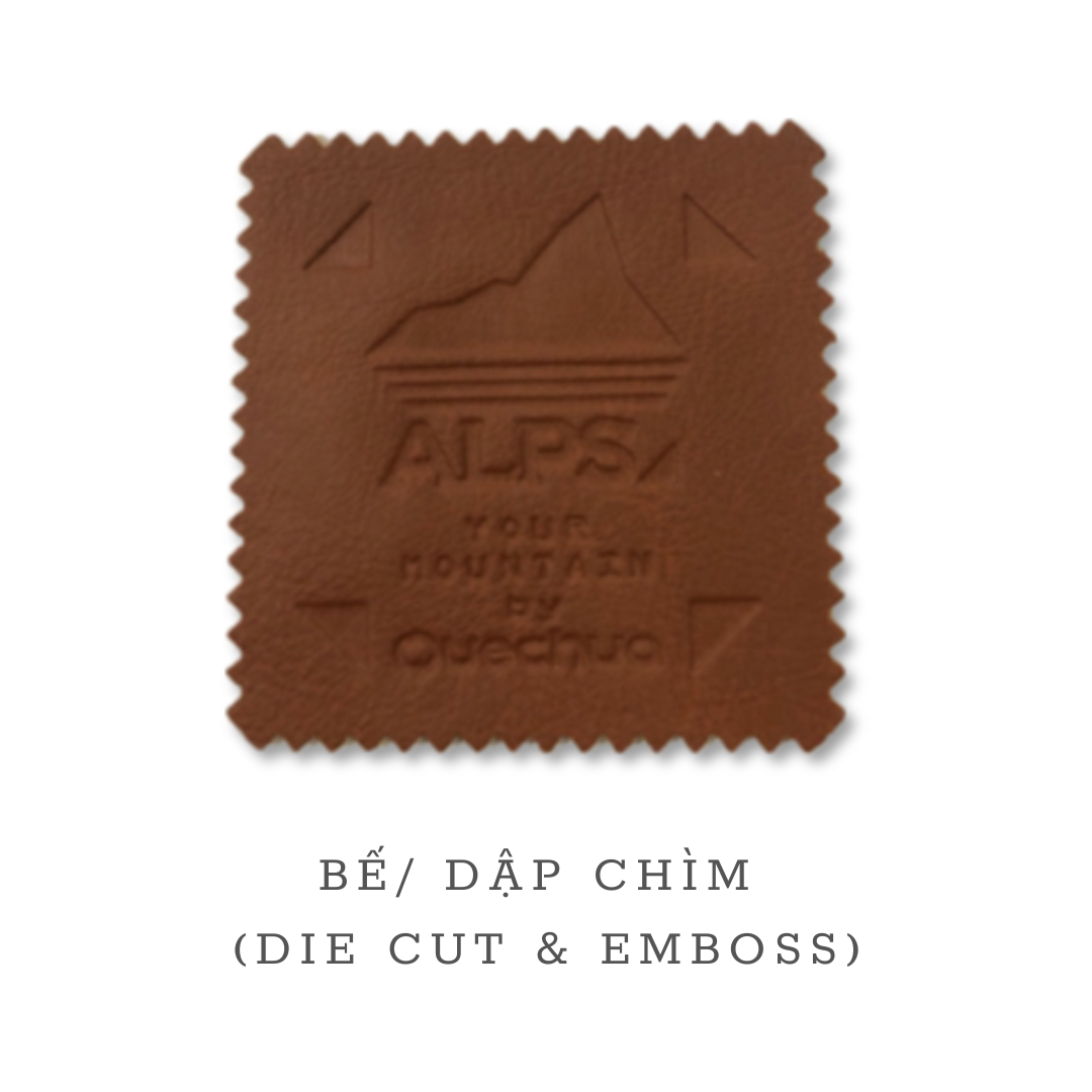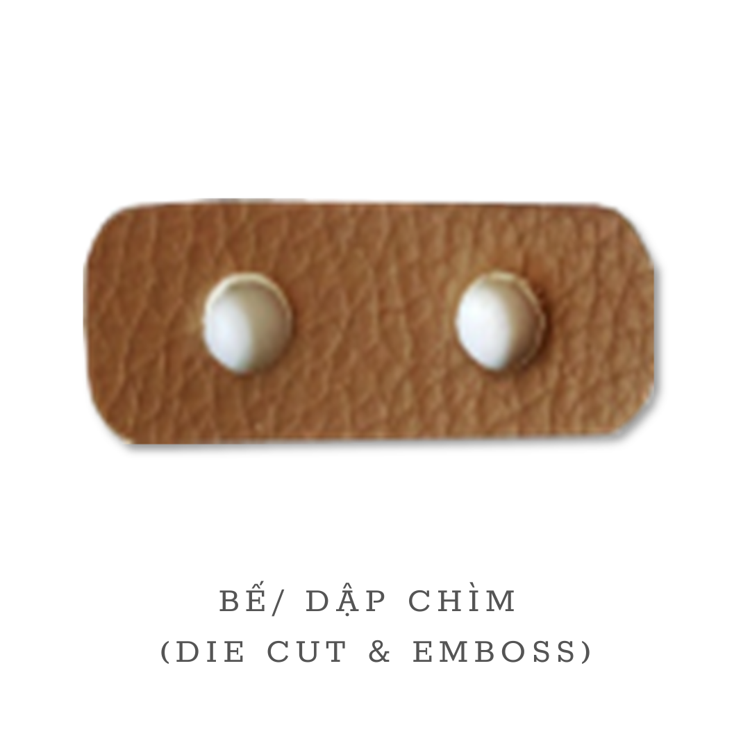 Gia công logo bằng phương pháp dập nổi, dập chìm và cắt bế khuôn chính xác, công suất 6.000 sản phẩm/ngày.